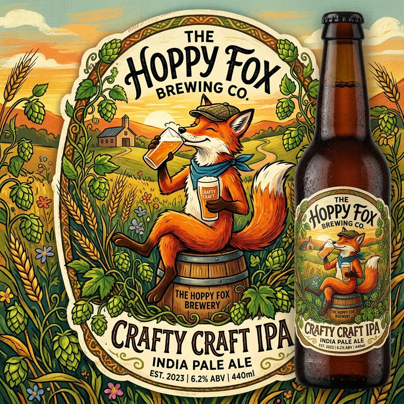 An illustrated label for a brewery, featuring a vibrant and whimsically coloured fox enthusiastically savouring a beer, comfortably sitting amidst surrounding hops and barley. The fox and the accompanying florals capture the essence of craft beer culture. The overall label design is created using a digital illustration style peppered with bold brushstrokes and visible textures, channeling the craft beer-inspired aesthetic with a fun spin.