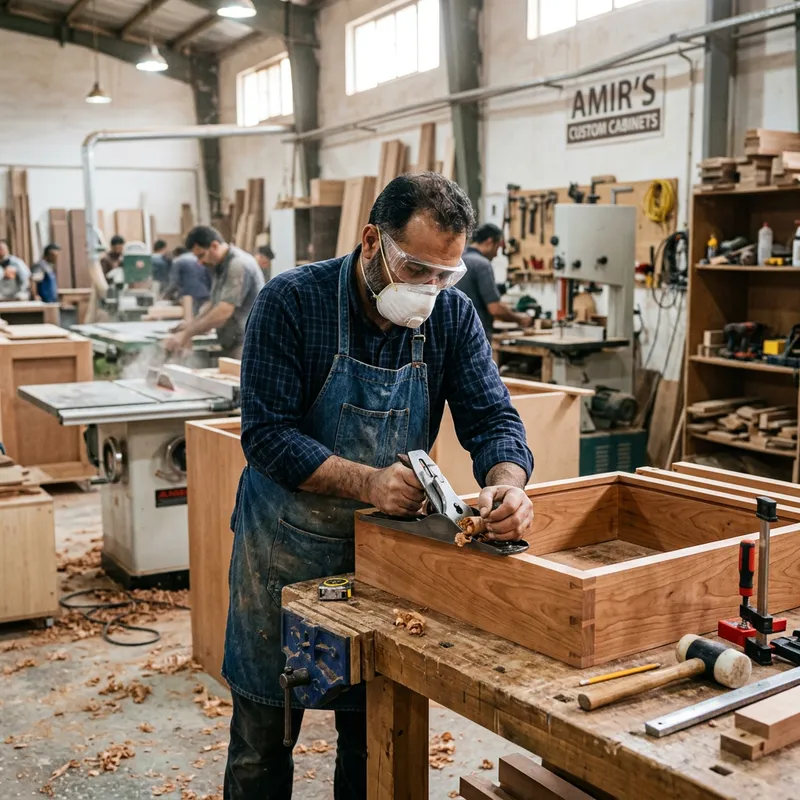 Masterful Middle-Eastern Craftsman Crafting Modern Kitchen Cabinet