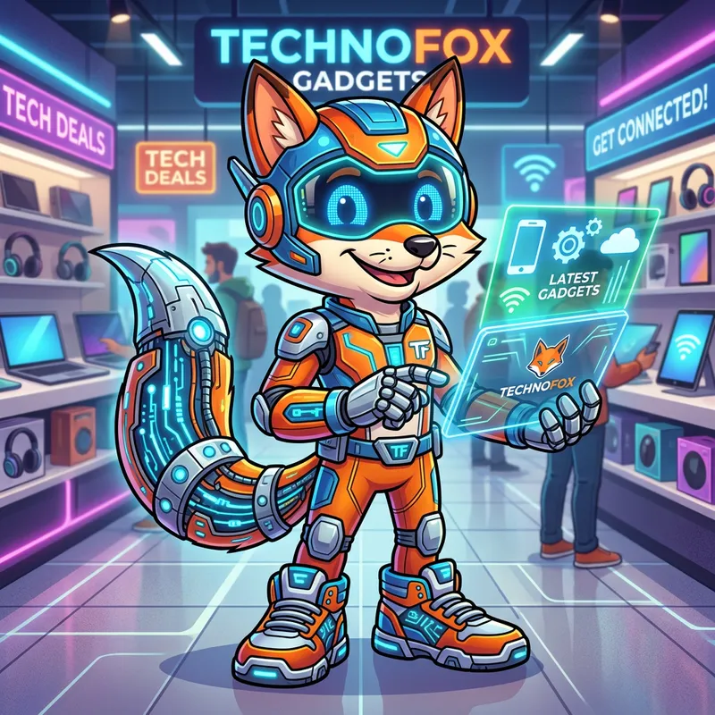 Create a corporate mascot for a technology store; I want the mascot to be a fox with LED eyes, metal-detailed paws, futuristic shoes, a futuristic helmet or visor, a friendly smile, a mechanical tail with lights or circuits, and a device in hand displaying a hologram or tablet, and 2D animation.