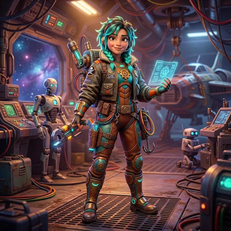 Create 3D concept art of a stylized Disney Pixar style character. It's a space pirate engineer with an extravagant futuristic design. Add elements to emphasize she's an engineer and pirate, featuring a semi-realistic cartoon style with vibrant colors and studio lighting.