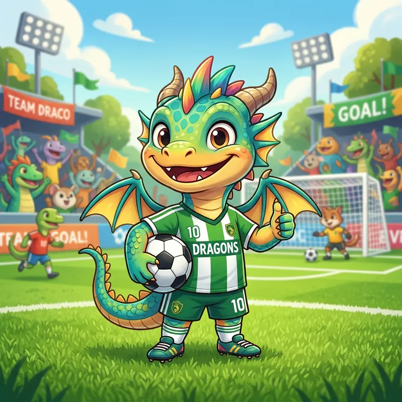 Create a fun avatar of a lizard dragon with a soccer field background.