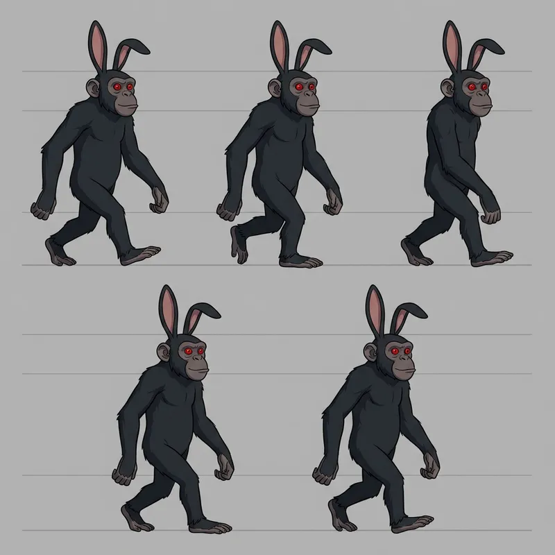 Create a chimpanzee with red eyes and rabbit ears, in walking, running, jumping, and dying movements, with a minimum of 5 images per animation.