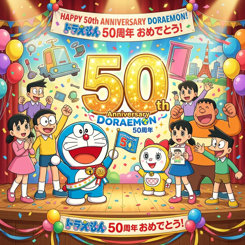 Create an image of Doraemon with the most important characters featuring the large number 50.
