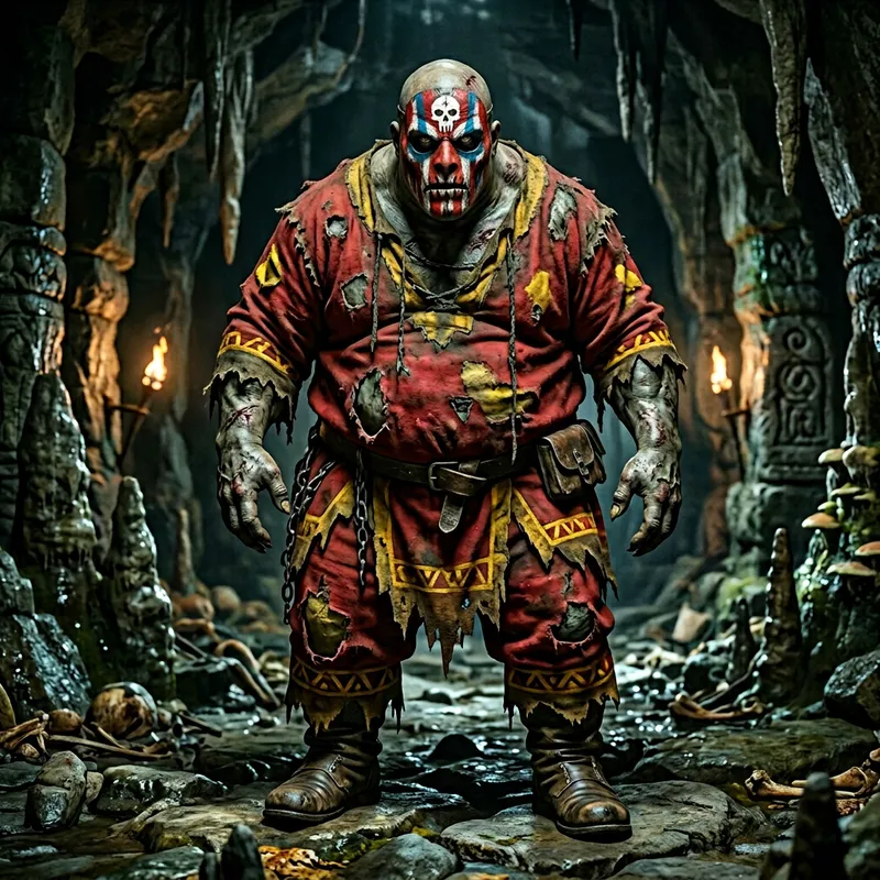 Create a monster with these characteristics: Monster name: Tupa Species: Zombie Age: 500 years Habitat: Underground Symbol: Skull Physical: Fat, tall, short arms, bald, red, white, and blue mask, red clothing with yellow, supernatural strength.