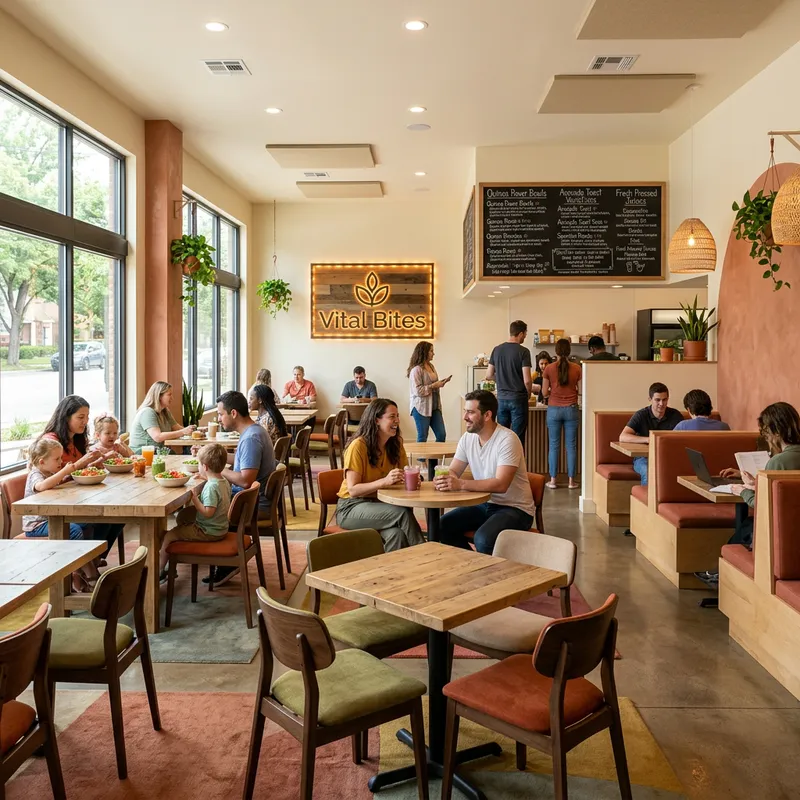 Create a healthy food restaurant named Vital Bites with warm colors and spaces for everyone, featuring elegant chairs and tables.