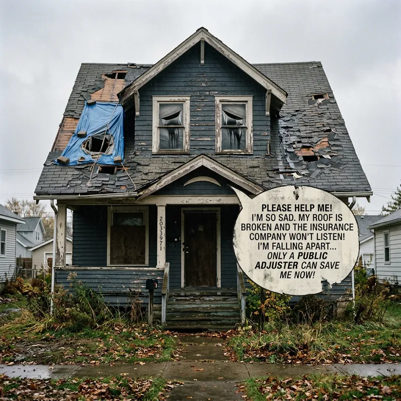 Create a talking house that has roof damage and is very sad; the only solution is a public adjuster who can save it.
