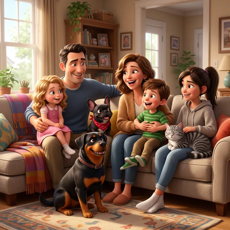Create an animated image of a family consisting of a father, mother, a 6-year-old son, a 4-year-old daughter, a 16-year-old daughter, a medium Rottweiler dog, a black mini French dog, and a gray tabby cat.