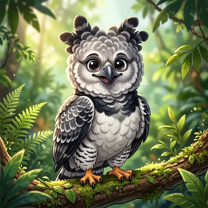 Create a mascot for an Instagram page. The image will be used in various posts. It must be a Harpy Eagle. It will be the page's mascot. Make it cute, eye-catching, and expressive.