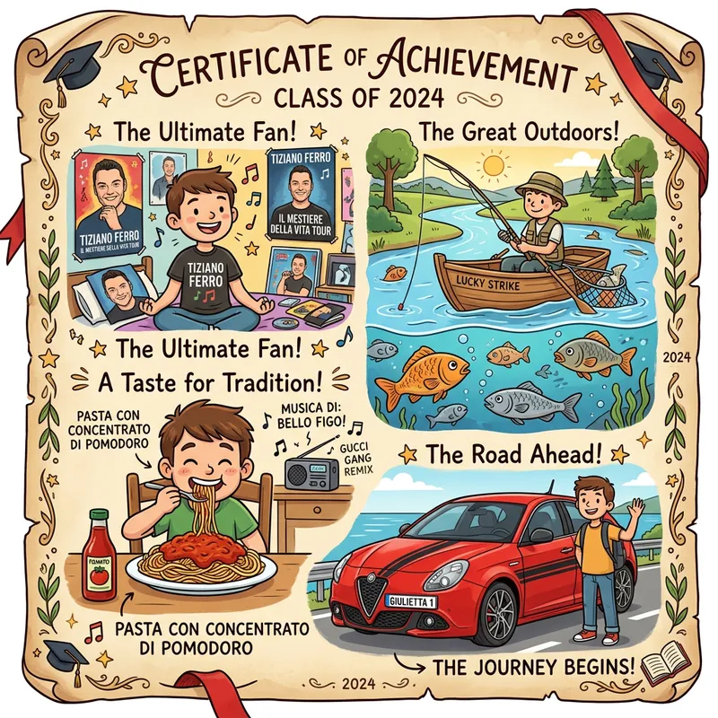 Create a cartoon with this boy in a graduation scroll style featuring these elements: Tiziano Ferro posters hanging, him fishing in a river with a small boat and fishing rod, many fish and carp, him eating pasta with concentrated tomato, music by Bello Figo, Alfa Romeo Giulietta with black stripes on the doors.