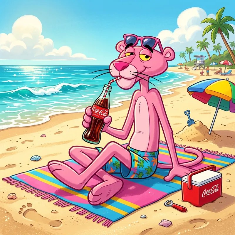 Pink Panther Sipping Coca-Cola at the Beach
