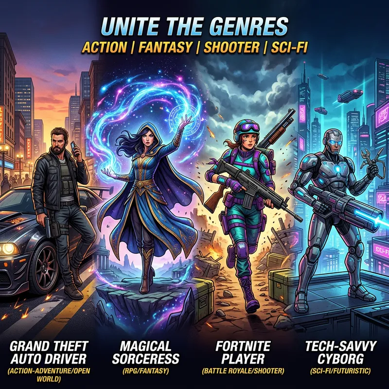 Create a 2048 x 1152 banner featuring some generic game characters such as a grand theft auto driver, a magical sorceress radiating with cosmic energy, a fortnite player with heavy guns, and a tech-savvy cyborg armed with futuristic gadgets. Each character should represent a different popular gaming genre, making for a diverse and dynamic composition.