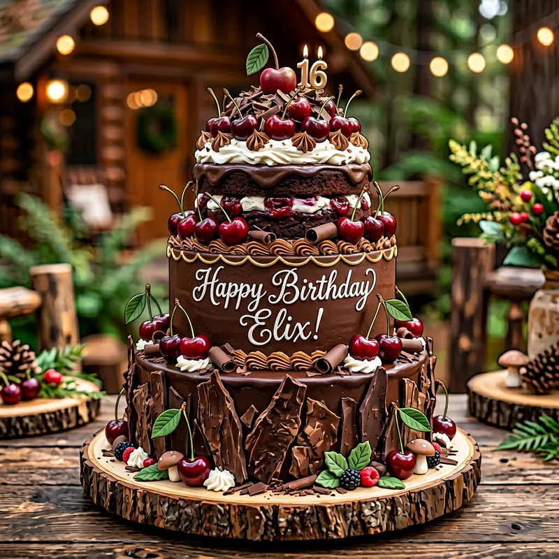Create a 3D cake design with a black forest theme. It should say Happy Birthday Elix! The cake should have layers and include decorations as described. Ensure the final design is vibrant and visually appealing, balanced negative space and clean symmetry, precise linework and subtle micro-shading.