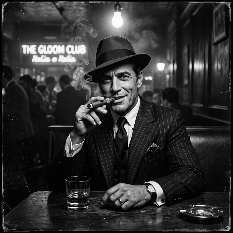 Create a black and white noir-esque image portrait inspired by the gangster aesthetic. A charismatic Italian man is depicted, outlined by dramatic shadows and lighting. He is confidently smoking a cigar, with his tailored suit setting him apart. The image should mimic the classic 35mm film photography style, reminiscent of a shot taken by a vintage Leica M6 camera, complete with film grain qualities.