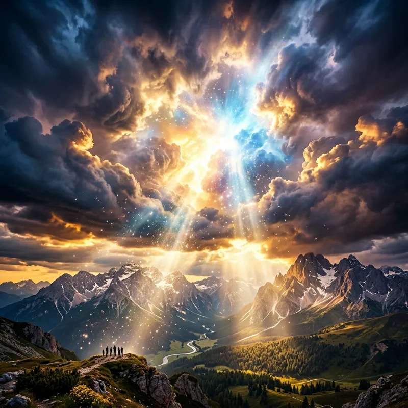 Create a breathtaking image of a divine light emanating from the sky, symbolizing the power and majesty of God. The scene should feature a radiant, otherworldly glow breaking through dense, dramatic clouds, illuminating the earth below with an ethereal brilliance. The colors should blend shades of gold, white, and celestial blue, evoking a sense of awe, reverence, and spirituality. The light should feel alive and transcendent, with subtle details like shimmering particles in the air to convey divine energy. The setting can be natural, such as mountains or an open field, to emphasize the grandeur of God's creation