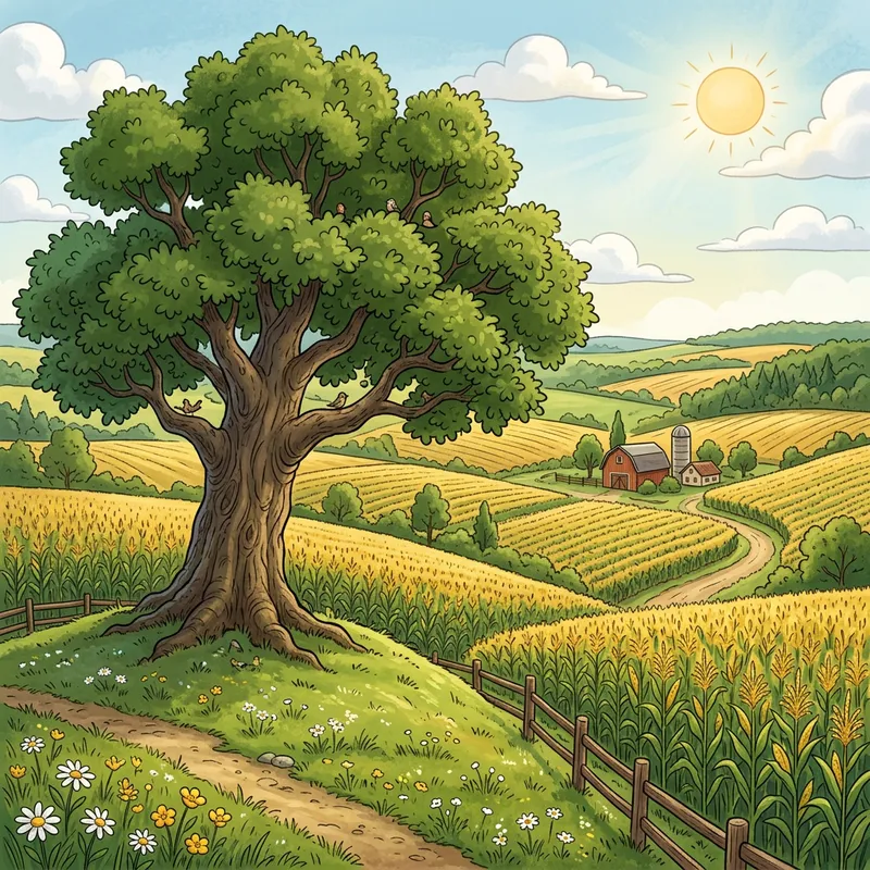 Charming Cartoon Oak Tree Overlooking Corn Fields