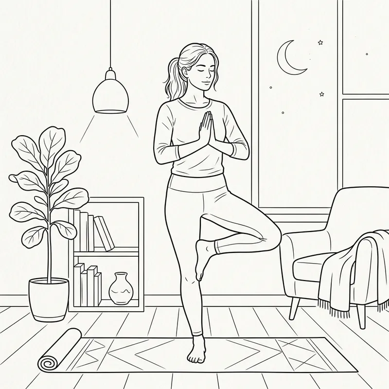 create a clean line black and white drawing of a person doing gentle yoga poses in the evening inside their home.