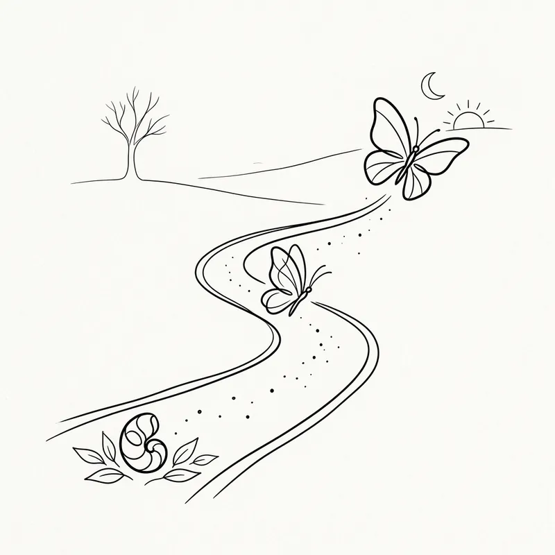 Create a clean line black and white image, not too much detail of a subtle, artistic portrayal of a journey, symbolizing transformation, growth, or healing.