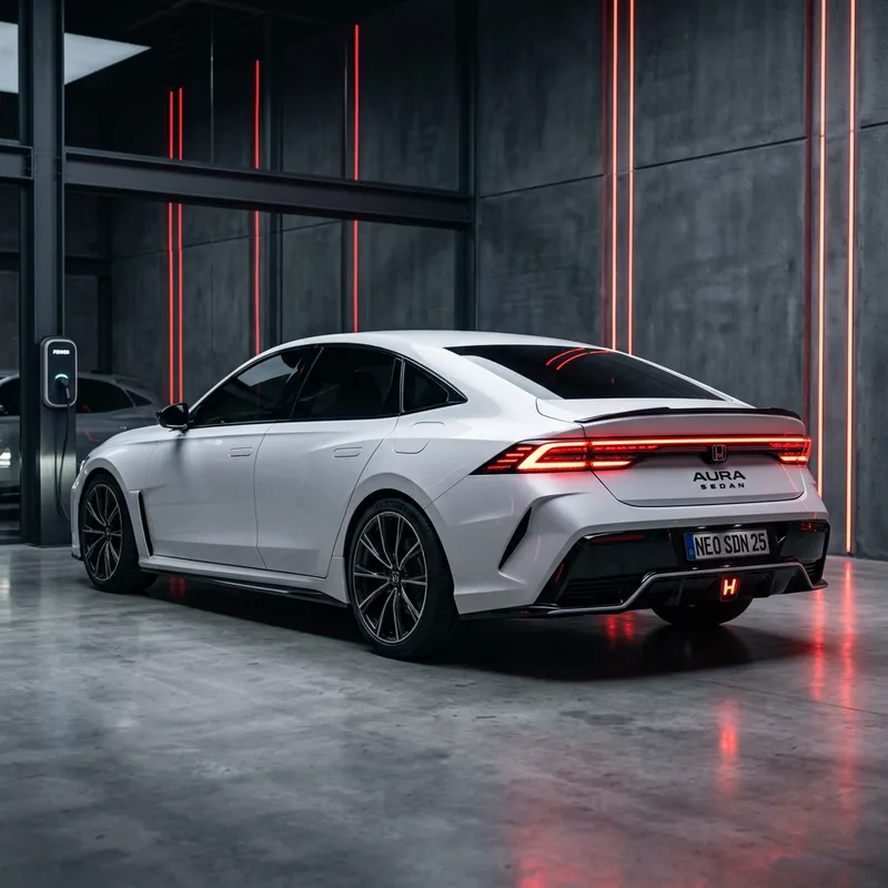 Create a detailed and modern image of a futuristic sedan, similar to the 2025 Honda Prelude, shown from a rear three-quarter angle. The car should have a sleek, angular design, with a glossy white paint finish and distinctive LED tail lights that wrap around the vehicle. Place the car in a minimalistic, industrial-style indoor environment, such as a clean and polished garage or showroom. The background should be simple, with metallic walls and a polished concrete floor, featuring subtle, moody lighting. Add a touch of color with neon accents, like red lights on the walls, to enhance the modern and futuristic vibe. Ensure the image has a clean, sophisticated, and high-tech aesthetic, with a focus on the vehicle's sleek design and advanced features.
