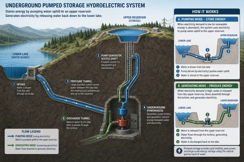 Create a diagram showing an underground pumped storage hydroelectric system drawing water source from a lake. Show the illustration how the system works including cross section diagram.