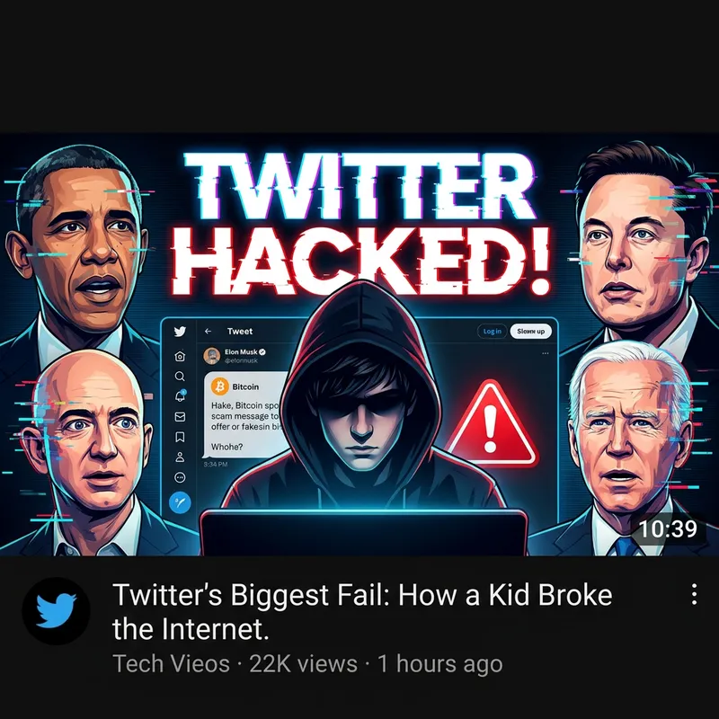 Create a dramatic and eye-catching YouTube thumbnail for a tech documentary video titled 'Twitter’s Biggest Fail: How a Kid Broke the Internet.' The thumbnail should include: A stylized image of a teenage hacker (young male in a hoodie, face partially obscured, lit by the glow of a computer screen). Stylized, semi-abstract or illustrated faces of major public figures: Barack Obama, Elon Musk, Jeff Bezos, and Joe Biden — each looking surprised, concerned, or digitally glitched. A mock Twitter interface or chat bubble showing a fake Bitcoin scam message (blurred or minimal text). A red warning or alert symbol to emphasize the sense of digital emergency. Bold, dramatic text in large font: 'TWITTER HACKED!' (with a tech-glitch or digital distortion effect; glowing or high-contrast for readability). Color scheme: dark with electric blues and reds to evoke a high-stakes cybersecurity breach. Keep the layout clean and dynamic, ensuring the central message is visually striking and instantly readable at thumbnail size. Aim for a tone that is cinematic, mysterious, and urgent — perfect for a real-life tech investigation.