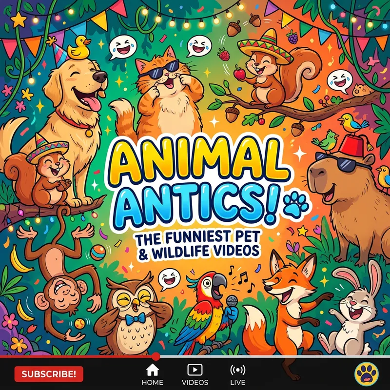 Create a festive and humorous image for a video-stream platform channel. The theme of the channel is funny animal videos. The backdrop should incorporate vibrant colors and cartoon-style drawings of various animals such as dogs, cats, squirrels, birds, and monkeys, capybara, all in hilarious poses or situations. The animals could be seen laughing, making goofy faces, or juggling objects. The design should create a light-hearted, entertaining atmosphere ideal for a channel with humorous animal content.