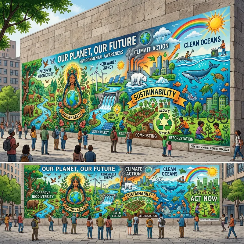 Create a grand mural art depicting various concepts related to environmental awareness.