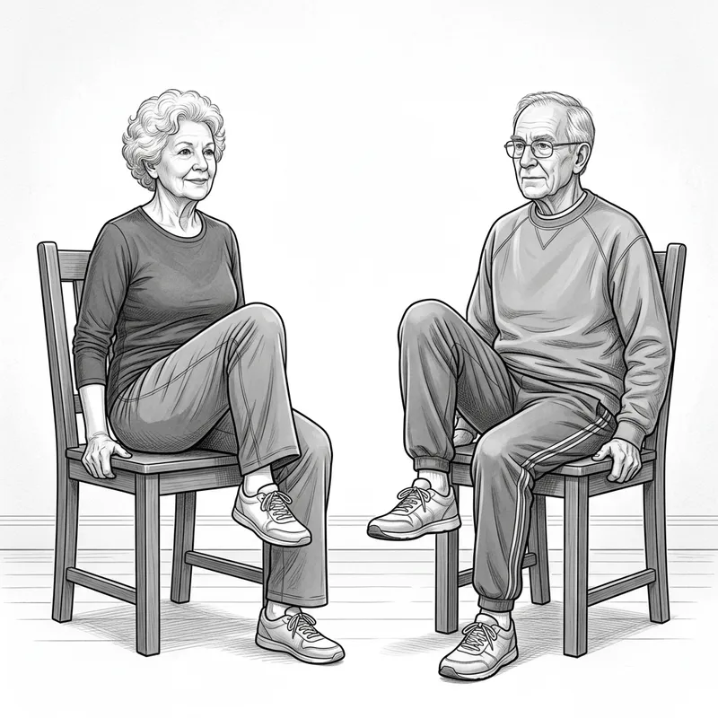 Create a high-clarity, black and white (grayscale), semi-realistic illustration of a senior man and woman performing the chair knee-raise exercise. Each person should be seated in their own sturdy chair, spaced slightly apart. Their bodies should be positioned to clearly demonstrate the movement: one knee raised toward the chest, the other foot flat on the floor, hands resting lightly on the chair sides for support. Capture the action mid-movement to convey motion and proper form. The setting must be minimal and uncluttered—plain background, no distractions. Focus on anatomical accuracy, safety, and instructional clarity. Avoid cartoonish or exaggerated styles—this should look suitable for an educational senior fitness guide.