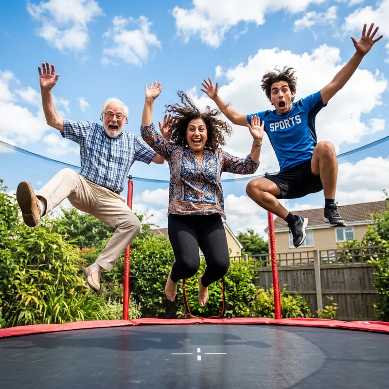 Create a humorous depiction of three friendly individuals with different descents: a middle-aged Middle-Eastern woman with curly hair, a young Hispanic man with sporty attire, and an elderly Caucasian man with glasses, all of them joyfully jumping on a large red trampoline in the midst of a sunny backyard. Emphasize the gravity-defying movements and their surprised yet exhilarated facial expressions for comical effect. Include a blue sky in the background with fluffy white clouds, giving the impression of them jumping really high.