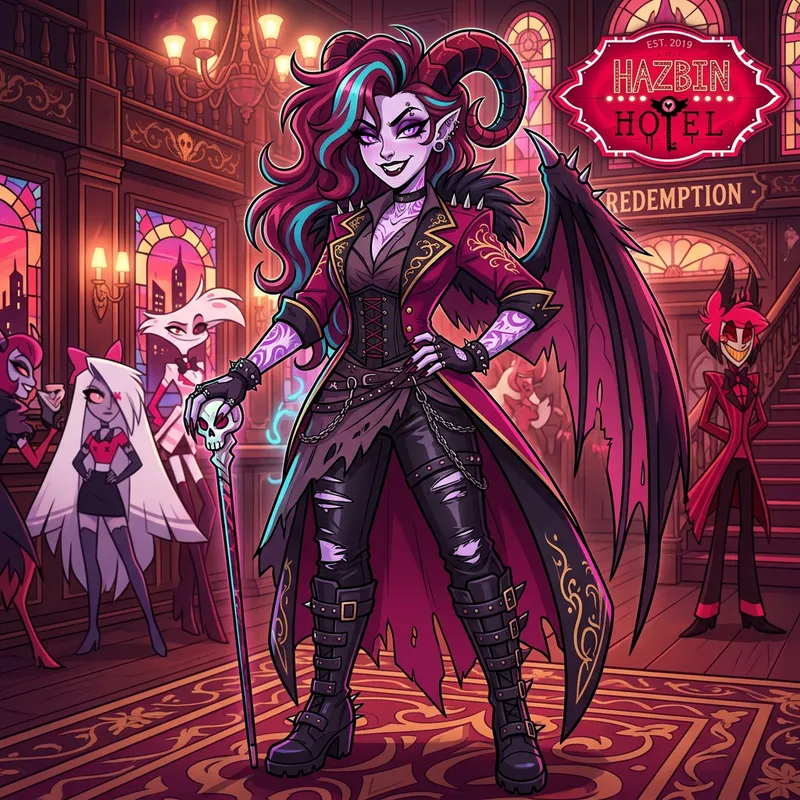 Create an image of Hazbin Hotel OC named Arianna who is 28 years old, 5'7", with unique physical features and a powerful personality.