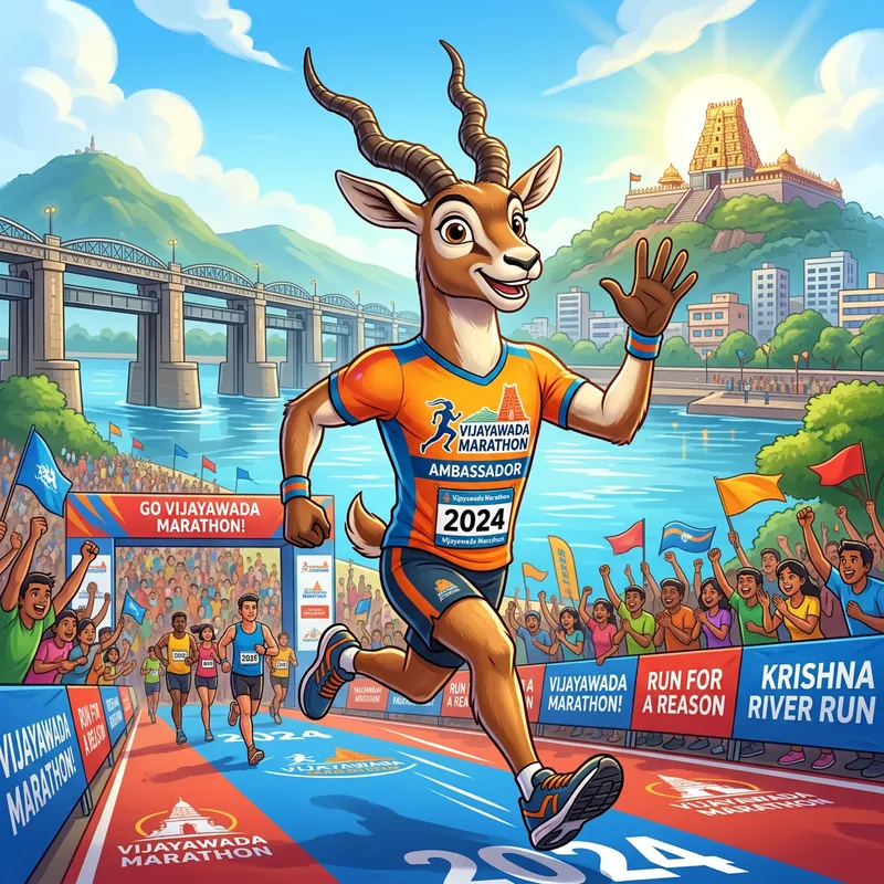 Create a mascot character of animals or Disney as an ambassador for Vijayawada Marathon. This mascot represents running and Vijayawada.