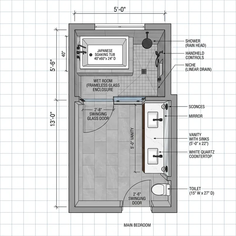 Master Bathroom Design: 5 ft x 13 ft with Soaking Tub