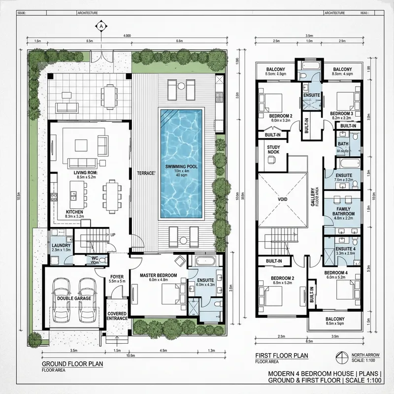 create a modern 4 bedroom house with swimming pool plans
