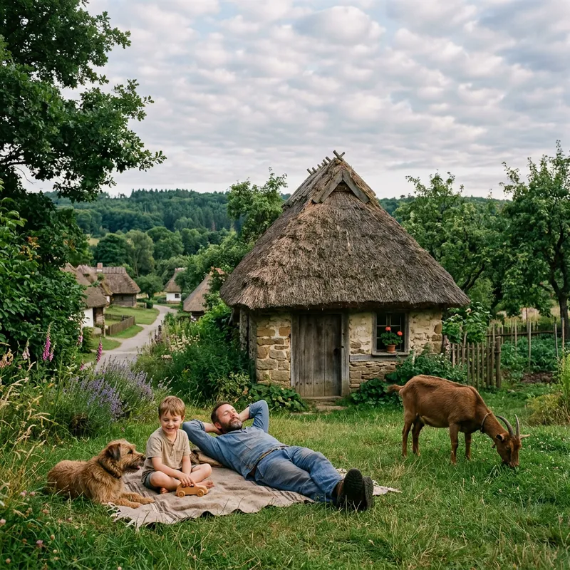 Create a peaceful village scene depicting a man relaxing on his back outside a rustic hut, surrounded by lush greenery and accompanied by his young son and friendly animals like a goat and dog, all under a dull evening sky with fluffy white clouds.