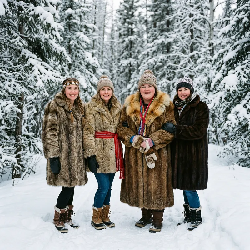 Métis Women in Real Fur Coats in a Winter Forest