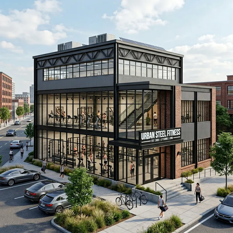 Create a realistic 3D design of a modern two-story gym building with an industrial architectural style.