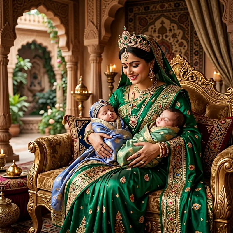 Create a richly detailed scene of Queen Sumitra, an elegantly regal figure, lovingly cradling her twin sons, Infant Lakshmana and Infant Shatrughna. She is adorned in resplendent, intricately embroidered attire featuring vibrant jewel tones of emerald green, sapphire blue, and ruby red, which flow gracefully around her. The twins, with their fair skin complexion, are gently swathed in soft, luxurious fabrics that mirror the richness of their mother's garments. Position Queen Sumitra slightly off-center in a lush, opulent setting that suggests a royal palace with ornate details and warm, ambient lighting that casts a gentle glow on her family. Use a shallow depth of field to softly blur the background, emphasizing the intimate bond between mother and sons. The atmosphere is infused with warmth and love, accentuated by a harmonious color palette of deep jewel tones contrasted with soft pastels.