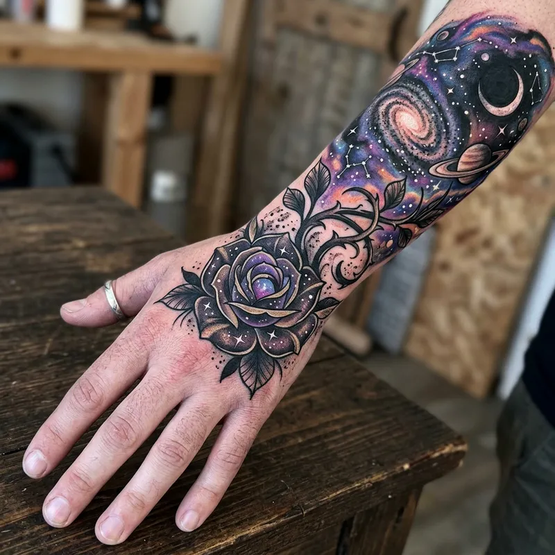Create a rose hand tattoo that can easily transfer to a space sleeve.