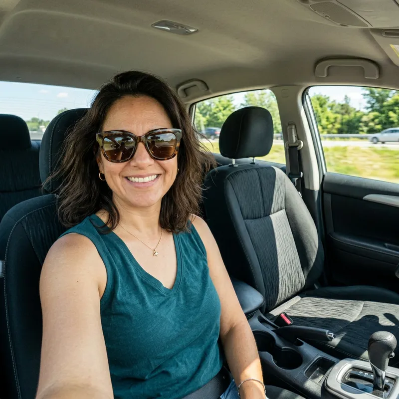 Create a selfie photo of a 42-year-old Hispanic woman with dark brown hair, a generous neckline, and thick-framed sunglasses on. The woman should be sitting in the passenger seat of a sedan car. The photo should be taken in the summer, so the woman's clothing will be minimal, and taken manually by an amateur person using a mid-range mobile phone.