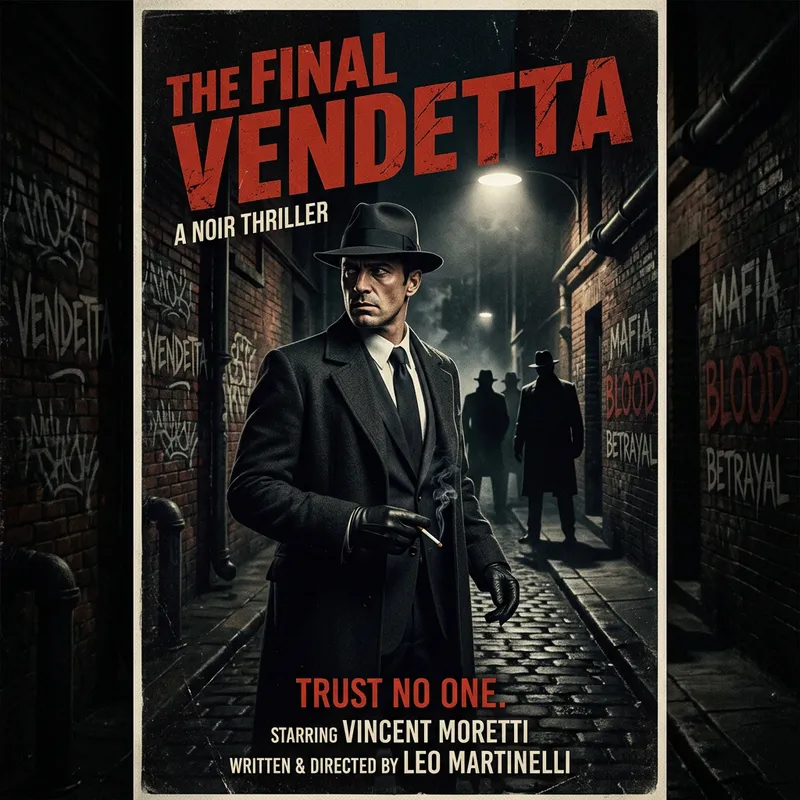 Create a striking mafia film poster in a noir visual style, featuring a brooding, sharply dressed male protagonist with slicked-back hair and a fedora, standing confidently in an urban alley with moody brick walls adorned with graffiti. The composition should convey tension, with the protagonist foregrounded while shadowy silhouettes of rival gang members loom in the background, illuminated by a single overhead streetlight casting dramatic shadows. The atmosphere is gritty and suspenseful, employing chiaroscuro lighting techniques to enhance the sense of danger. Utilize a color palette dominated by deep blacks, blood reds, and muted greys, evoking a classic 1940s film aesthetic. Incorporate stylized text for the film title at the top, using a bold, vintage typeface, and consider a slight tilt in the camera angle for a dynamic effect, reminiscent of vintage movie posters from directors like Francis Ford Coppola and Martin Scorsese.