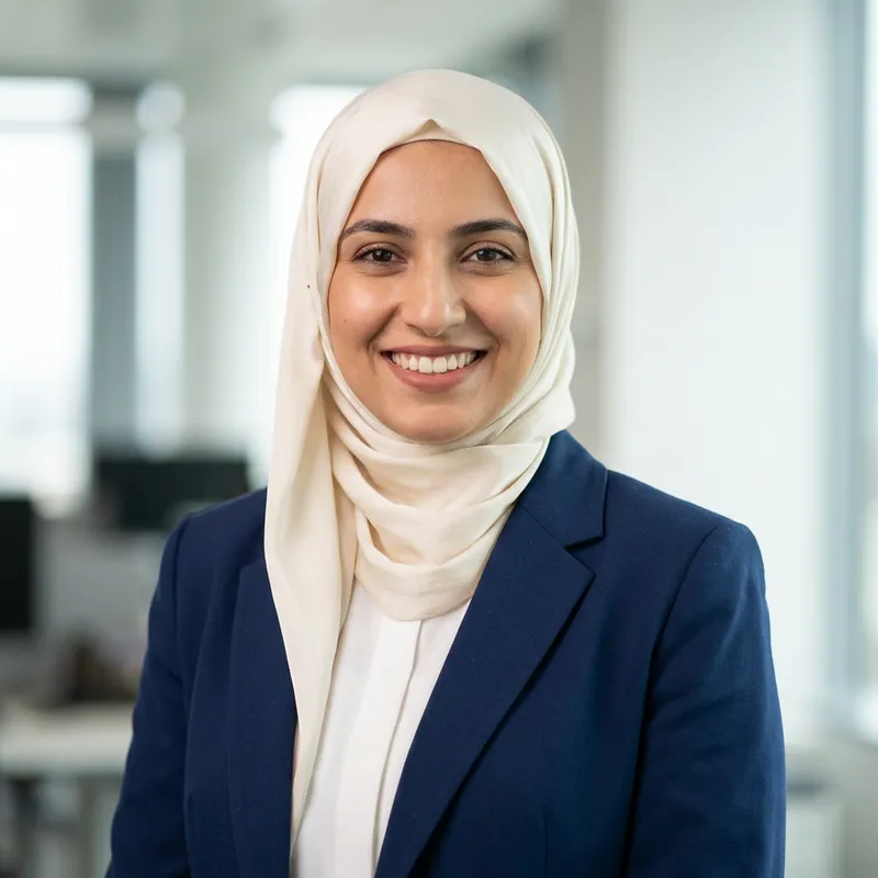 Create a striking portrait of a Muslim model gracefully adorned in an elegant hijab loosely draped. Use my photo as the model. It must be professional with a suit and an approachable warm demeanor.