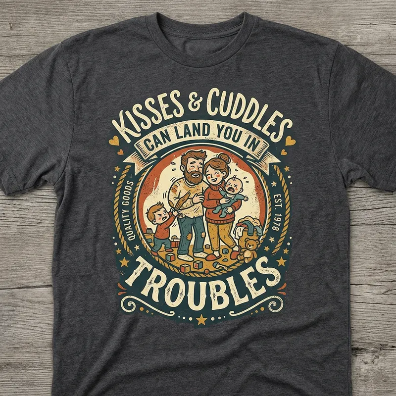 Create a t-shirt design for the quote 'kisses and cuddles can land you in troubles.'
