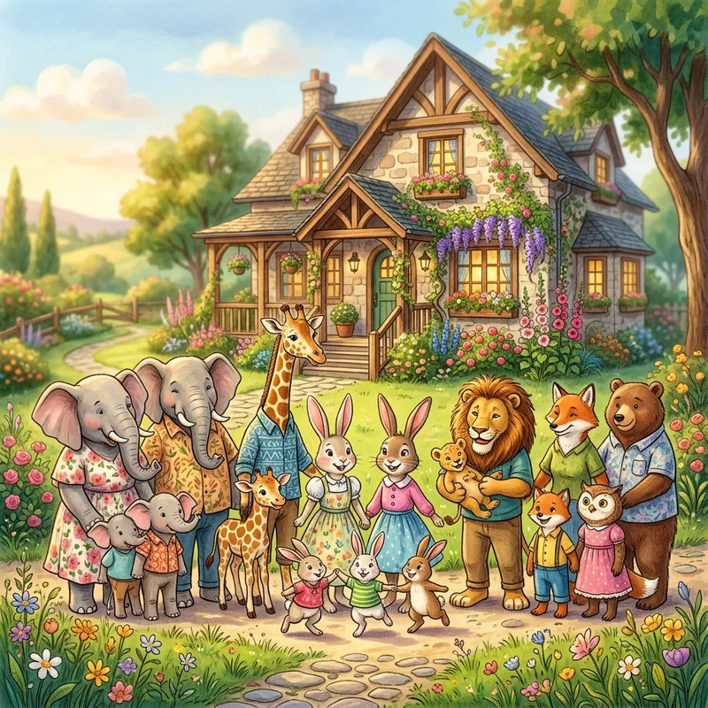 Create a vibrant, semi-realistic illustration featuring a diverse array of animals, such as elephants, giraffes, and rabbits, each with human-like bodies standing side by side, smiling joyfully alongside their young offspring. The composition should evoke a whimsical yet relatable atmosphere, blending cartoonish charm with realistic details, showcasing a large, inviting house in the background adorned with colorful flowers and greenery. Employ soft, warm lighting that bathes the scene in a golden hue, enhancing the cheerful ambiance. Use a rich color palette filled with bright greens, blues, and warm earth tones to create a sense of harmony and happiness. Incorporate a playful depth of field to draw focus on the characters while softly blurring the background, evoking a sense of warmth and family connection, reminiscent of illustrations by artists like Eric Carle or Maurice Sendak. The angle should be slightly elevated, allowing for a comprehensive view of the joyful assembly, ensuring each character and their unique expressions are clearly visible.
