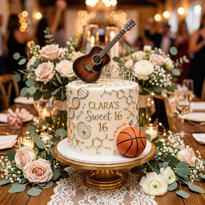 Create a visually stunning and elegant single-tier Sweet 16 cake designed with intricate biosciences motifs, featuring delicate DNA helixes and chemical structures elegantly piped in silver and gold icing. The cake should also incorporate elements representing a guitar, such as edible strings and a miniature guitar topper, alongside a realistic basketball motif, with textured fondant mimicking the ball's surface. The composition should be centered on a lavish wooden table adorned with soft-focus pastel flowers, while the cake is illuminated by warm, golden ambient lighting that casts gentle shadows, enhancing the cake's glossy finish. The atmosphere should be celebratory and whimsical, evoking a sense of joy and creativity, while the color palette should blend soft ivory, vibrant greens, and pops of bright orange from the basketball, harmonizing with the elegant metallic accents. Consider employing a shallow depth of field to emphasize the cake in the foreground, with a slight bokeh effect on the background, reminiscent of a high-end lifestyle photography style.