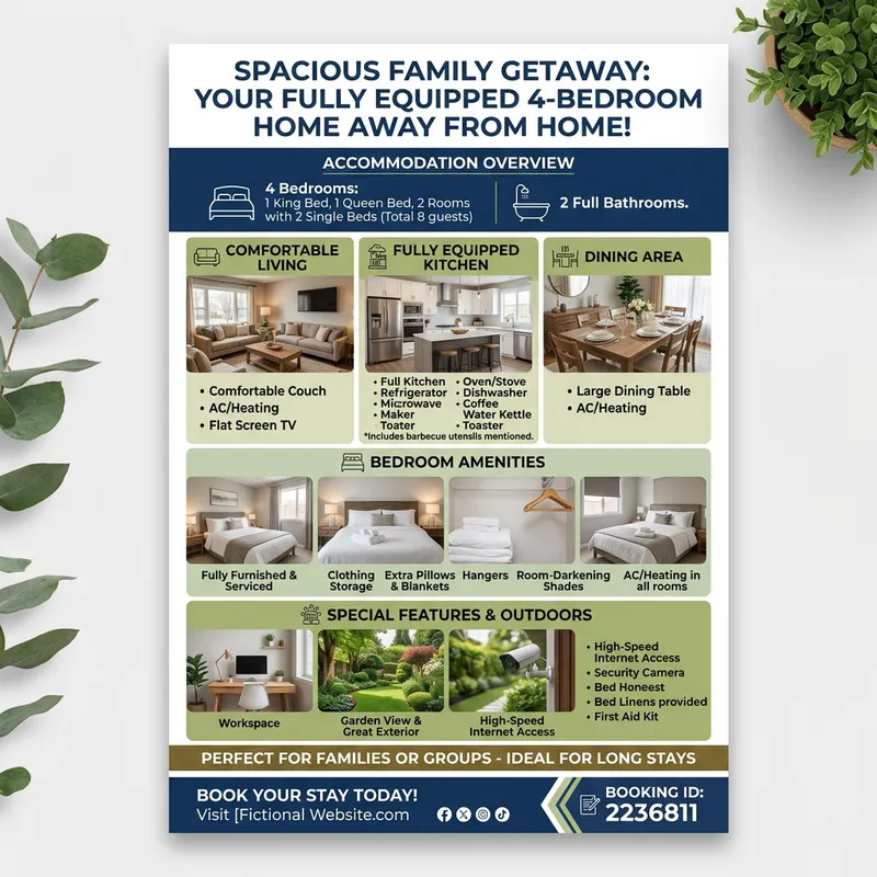 create an add for Number of bedrooms: 4 (1 king bed, 1queen bed, 1 room with 2 single beds, another room with 2 single bed) Number of bathrooms: 2 full bathrooms Living room features: Couch, air conditioning, heating, TV Kitchen features: Full kitchen with barbecue utensils, coffee maker, cooking basics, dishes and silverware, dishwasher, hot water kettle, microwave, oven, refrigerator, toaster, stove Dining area: Dining table, air conditioning, heating Bedrooms: Fully furnished and serviced , clothing storage, essentials, extra pillows and blankets, hangers, room-darkening shades, air conditioning, heating Additional spaces: Workspace, good exterior, internet access, security camera, bedlinens, first aid kit, garden view Special highlights: Spacious, comfortable, fully equipped for families or groups, great for long stays.