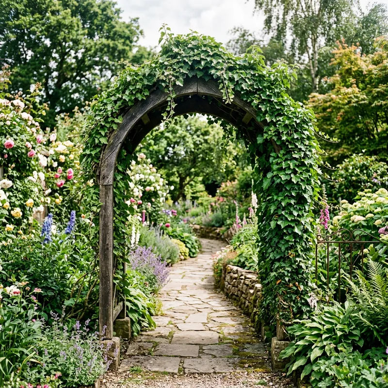 create an arbour arch with ivy growing on it at the beginning of a path.