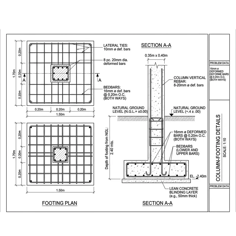 Create an architectural illustration of column-footing details in plan and section view, excluding the tie beam. The drawing should follow a 1:10 scale. Problem: 1. From the given dimension of reinforced concrete column (0.35 x 0.40 x 12.30 meters), prepare a Column & Footing Detail complete with specifications using the minimum design value. REQUIREMENTS: 1. Depth of footing from NGL: 2.40 mts. 2. Spacing of bedbars. (lower bars and upper bars): 0.20 mts. OC. 3. Bedbar diameter: 16mm* © def. bars. 4. Lateral ties: 10 mm? @ def. barsAll elements and sizes/dimensions should be illustrated.