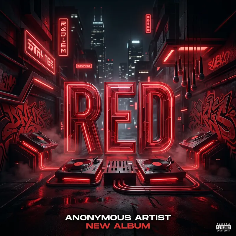 Create an image of a hypothetical rap album cover in an alternative aesthetic. The prominent color should be red, reflecting the title of the album. The design should encapsulate a 3D style, giving it a cinematic appeal. Include elements typically associated with the rap genre, such as microphones, turntables, or graffiti. Please exclude any specific rapper or public figure and keep the image anonymous.
