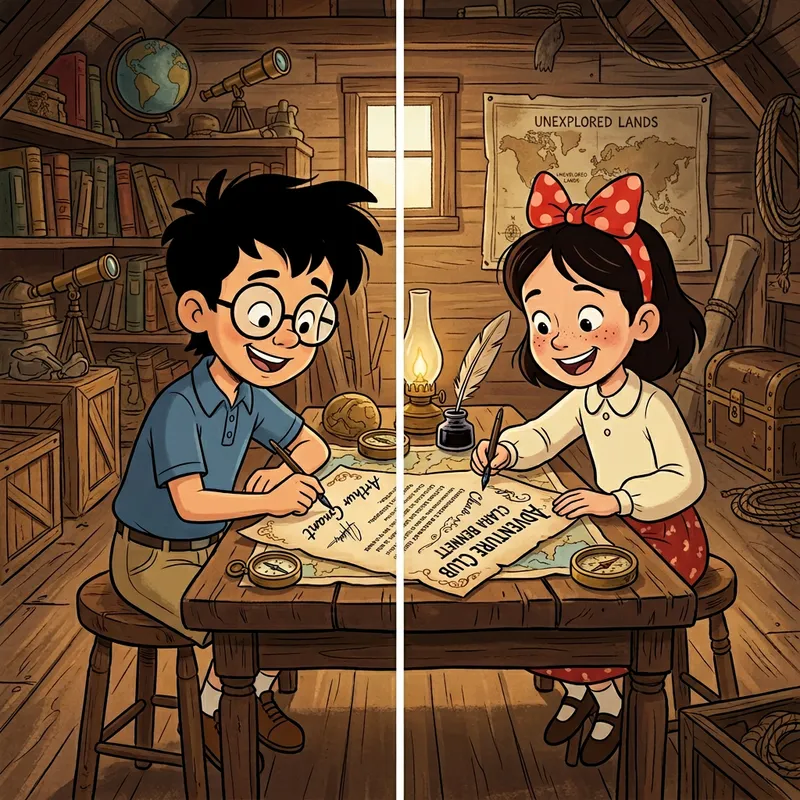 Create an image of two kid characters characteristic of adventure animations, one boy with round glasses, square face, a mop of black hair, and wearing a polo shirt tucked into khaki shorts, and a girl with a bow in her hair, freckles, a full-sleeved blouse and a skirt, signing a contract in a setting reminiscent of an old attic adorned with vintage explorer's items. One picture is girl and one picture is boy.
