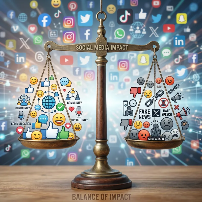 Create an image representing the impact of social media. The image should depict a balanced scale, representing the balance between positive and negative impacts. On one side of the scale, depict positive symbols such as communication symbols, global connection icons and thumbs up emojis. On the other side, depict negative symbols such as thumbs down emojis, sad faces and broken chain links. The background should be filled with various social media icons fading out into the distance.