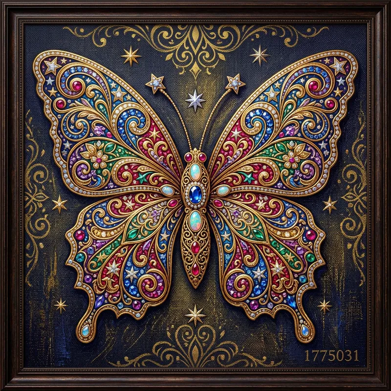 Create an intricate butterfly pattern. The design should be carefully composed of swirls, stars and decorative elements, each encrusted with shimmering jewels. The artwork should be represented in a fantasy genre. Additionally, the creation should be inspired by flamboyant and intricate detail. The medium used should appear as bold saturated colors on a textured canvas.